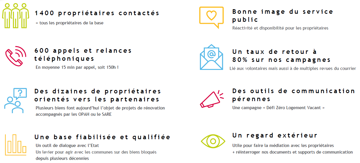 L'implication des volontaires a permis de contacter 1 400 propriétaires, d’effectuer 600 appels téléphoniques, d’orienter des dizaines de personnes vers les bons partenaires, et d’obtenir un taux de retour record de 80 % sur les campagnes.